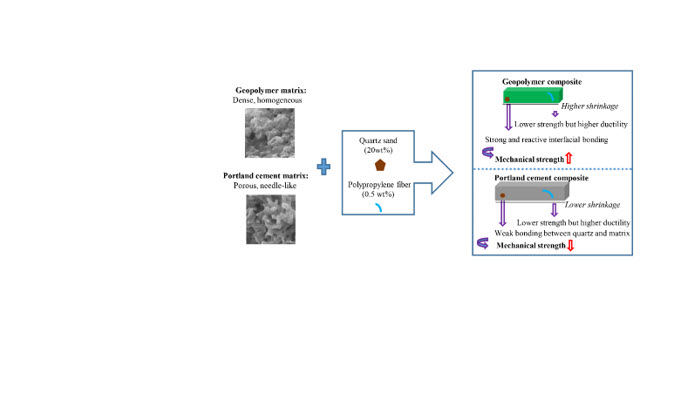 This study evaluates the mechanical performance of a metakaolin-based geopolymer matrix reinforced with quartz particles and polypropylene fibers, in comparison with a Portland cement-based matrix. Compressive strength, shrinkage, and flexural strength tests reveal that incorporating 20 wt% quartz particles significantly improves the mechanical properties of both matrices. The combined use of quartz particles and fibers contributes to shrinkage crack control and dimensional stability through synergistic effects involving particle–matrix interactions, fiber–matrix bonding, fiber surface characteristics, and toughening mechanisms. In the geopolymer matrix, the reinforcement effect of quartz particles is more pronounced due to the formation of a strong and chemically active interfacial bond. Compared with Portland cement composites, quartz particles increase the flexural and compressive strengths of geopolymer composites by approximately 2.5 and 1.3 times, respectively. The addition of 0.5 wt% polypropylene fibers slightly reduces strength but enhances energy absorption and alters the failure mode from brittle to more ductile. Overall, the results highlight the role of fibers in suppressing or arresting brittle fracture in cementitious and geopolymeric composites.